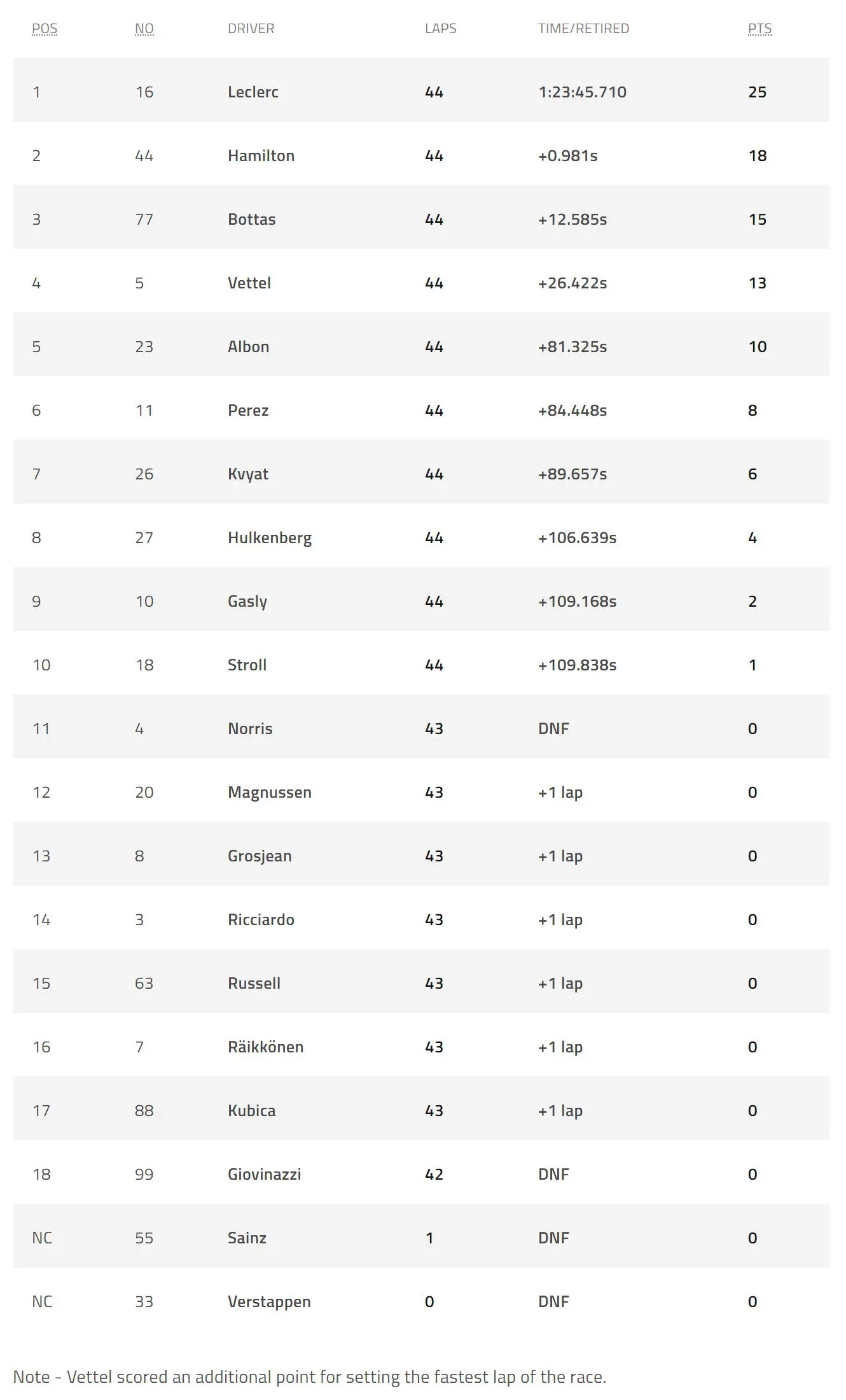 F1 2019 Belgian Grand Prix Results