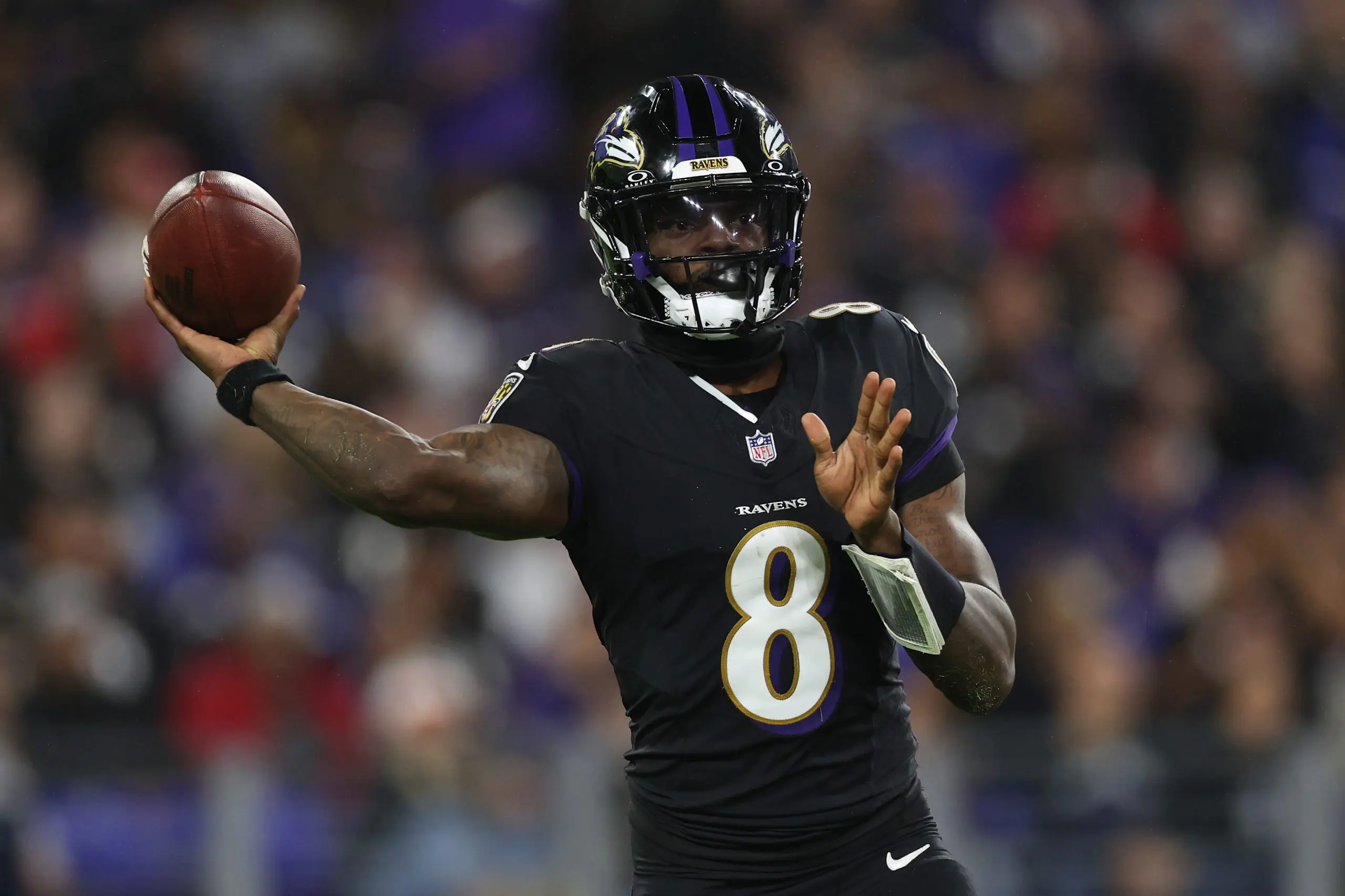 BALTIMORE, MARYLAND - SEPTEMBER 29: Lamar Jackson #8 of the Baltimore Ravens throws a pass during the third quarter against the Buffalo Bills at M&T Bank Stadium on September 29, 2024 in Baltimore, Maryland. (Photo by Patrick Smith/Getty Images)