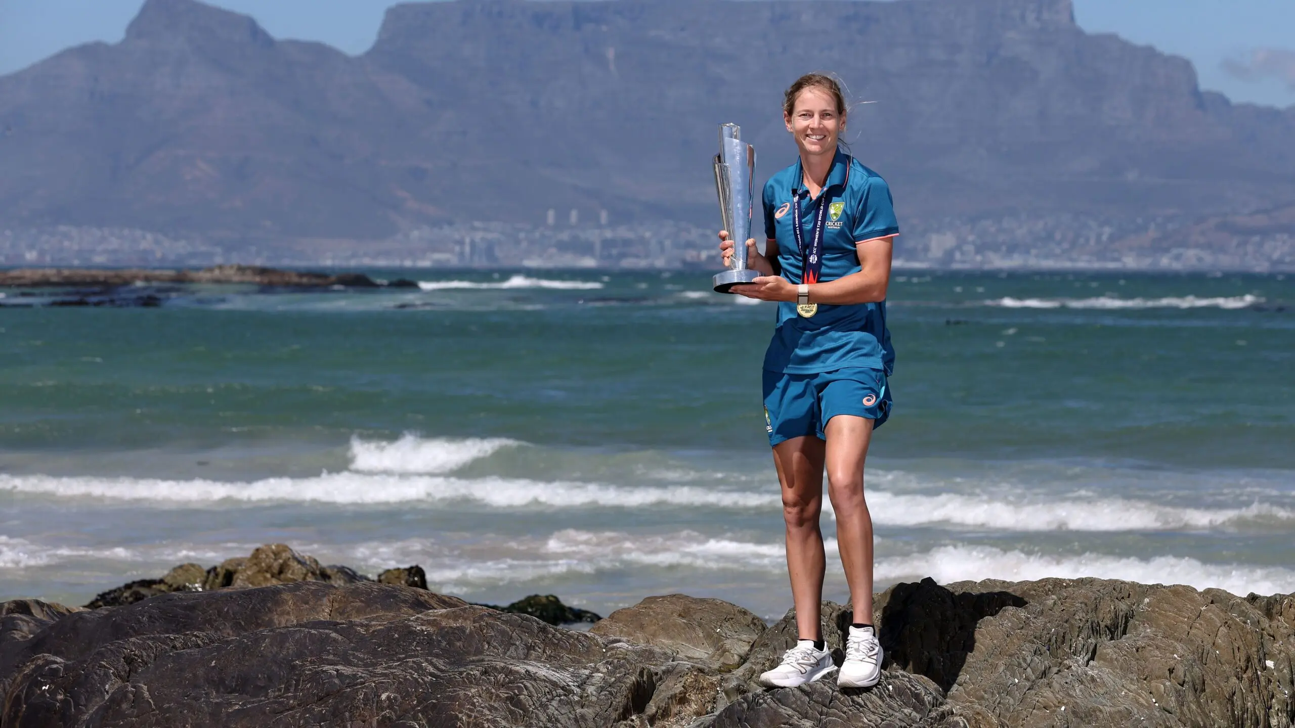 ICC Women’s T20 World Cup 2023 winning captain, Meg Lanning of Australia with the trophy in Bloubergstrand, Cape Town_