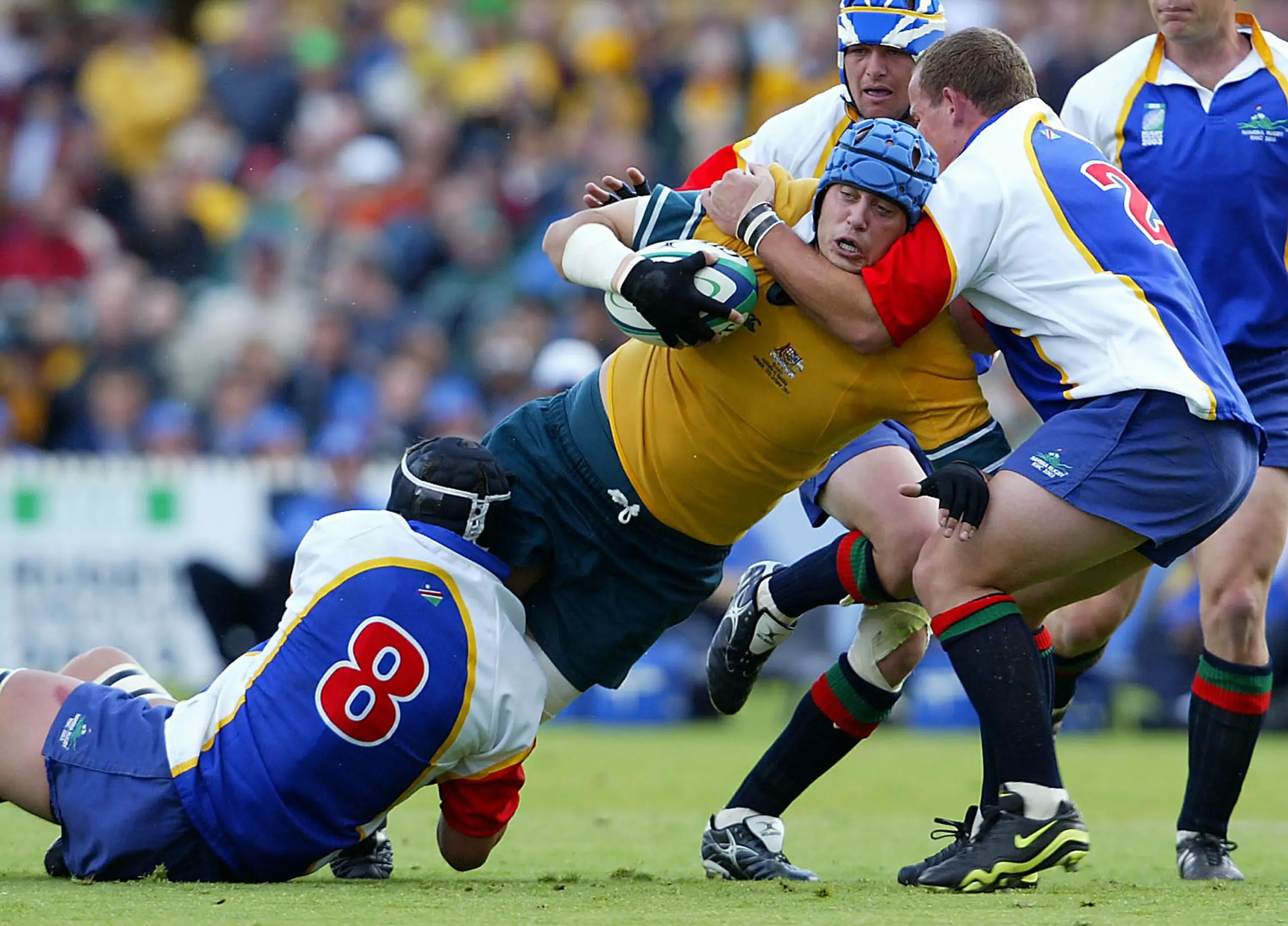 Nathan Sharpe of the Wallabies is tackled